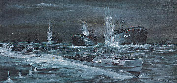 ke place in April and May 1944. The exercise was to be from 22 April until 30 April 1944. The landing exercises included all the aspects of the invasion. On board nine large tank landing ships (LST), the 30,000 troops prepared for their practise beach landing. The landing also included a live-firing exercise. Protection for the exercise area was supplied by the Royal Navy. There were two Destroyers and two Motor Gun Boats patrolling the entrance to the exercise area, and two Motor Torpedo Boats watched the Cherbourg area where German E-Boats were based. As the exercise went under way the LSTs suddenly found themselves under attack. The American servicemen were unaware that nine German E-boats had detected unusual radio activity in the area and had been ordered in investigate. It is believed that the E-boats encountered the two Destroyers and so immediately opened fire. LST number 507 was the first to be torpedoed. Lieutenant James Murdock stated that he noticed the boats on the radar but assumed that they were part of the exercise. As the German E-boats approached LST507 was suddenly hit by a torpedo on the starboard side which destroyed the side of the ship and exploded the engine room. LST507 had a crew of 447 men as well as the weight of trucks, jeeps and fuel, which caught fire. The flames spread and eventually the ship began to sink by the stern.